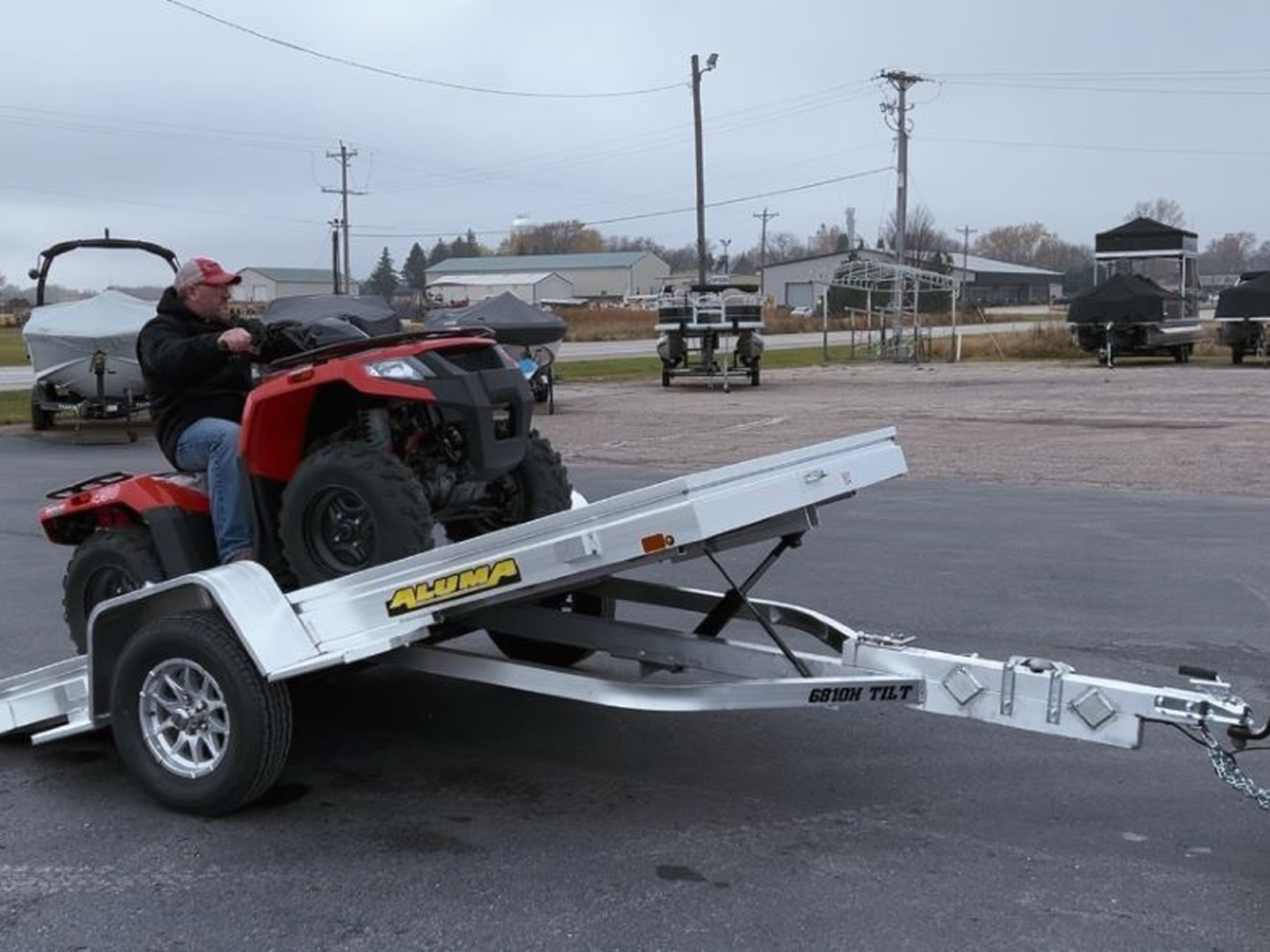 Standard Equipment • 3500# Rubber torsion axle (rated at 2990#) - No brakes - Easy lube hubs • ST205/75R14 Radial tires • Aluminum wheels • Aluminum fenders • Extruded aluminum floor • 7" Heavy-duty frame rail • Aluminum tongue, 48" long with 2" coupler • 7) Tie down loops (3 per side, 1 front center) • Tongue Handle • Receptacle Holder • Fender Steps • Swivel tongue jack, 1200# capacity • LED Lighting package, safety chains • Hydraulic dampener • Hydraulic gas shock for lift • Overall width = 92.5" • Overall length = 175" / 199" • 15° tilt